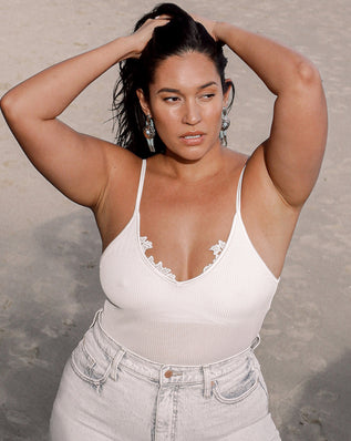 Knit in semi-sheer organza silk, our Bambi cami shimmers with a subtle metallic sheen that reveals the skin within. A dash of asymmetrical lace evokes the seductive play of lingerie but without the constraint, be free!